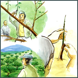その中に豊産で実が大きく、美しい紅がかかる優良種が一本あるのに気がつき、 その木を母樹として大切に育てました。