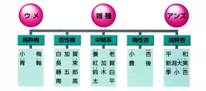ウメとアンズとの交雑性を基礎として分類します。