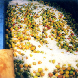 農家に持ち帰られた完熟梅は流水できれいに洗浄され品質を検査した後サイズ別に分けられ、それぞれのサイズの漬槽に漬け込まれます。