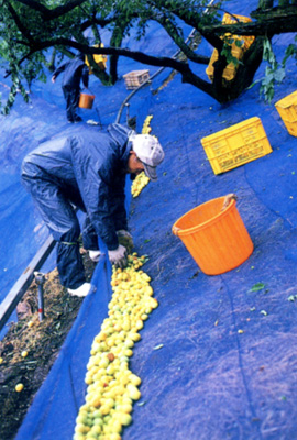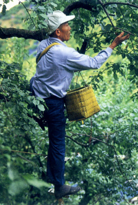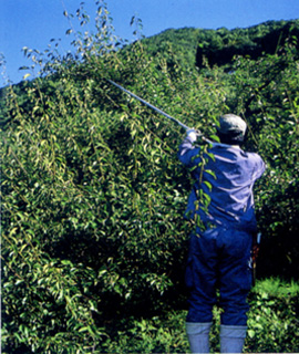 青梅として出荷する梅は平坦地での栽培が多く比較的収穫作業も簡単ですが、 落ち梅の収穫は山腹の傾斜にネットを張り落ちてきた梅を集めます。