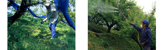 作業をやり易くするための梅畑の下の草刈りや、果肉の多い大きな実が育つように肥料が撒かれます。