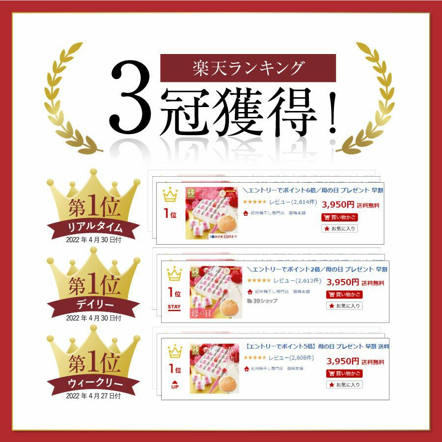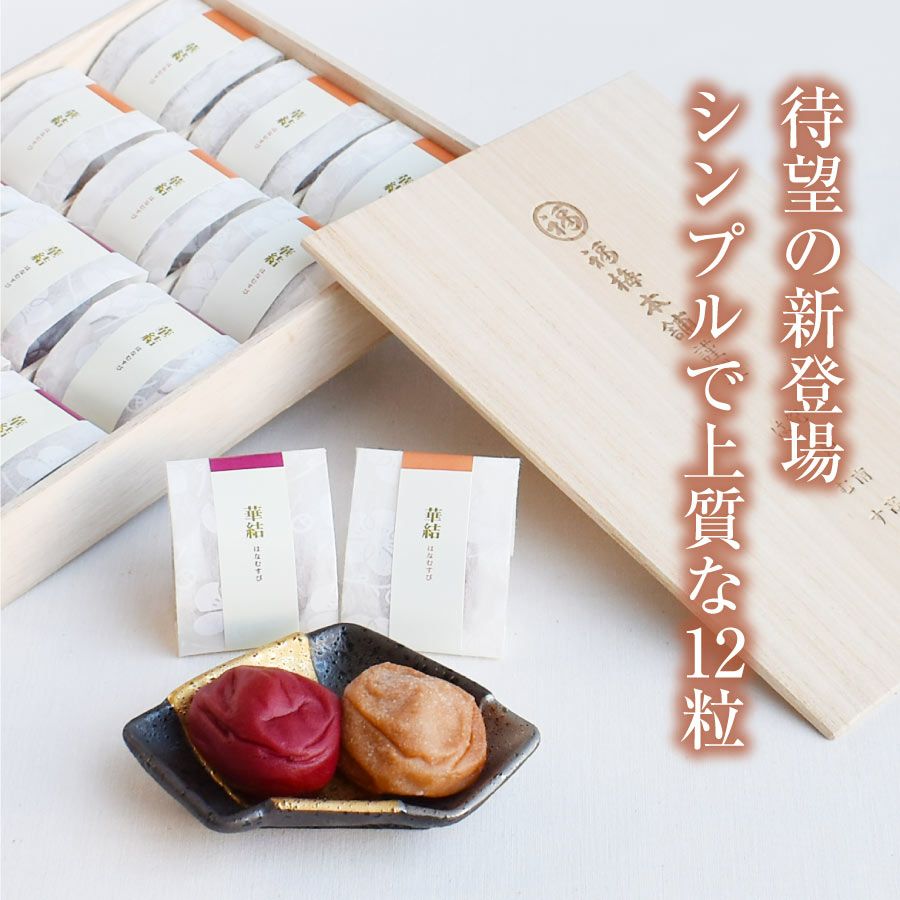 他の画像を見る 高級感のある桐箱入り・ 個包装選べる4種のお味 特選紀州南高梅華結(はなむすび)12粒入 送料無料 人気№1 木箱入 定価 ¥ 3,950 のところ 当店特別価格 ¥ 3,950 税込 会員価格あり 商品詳細を見る お気に入りに登録する