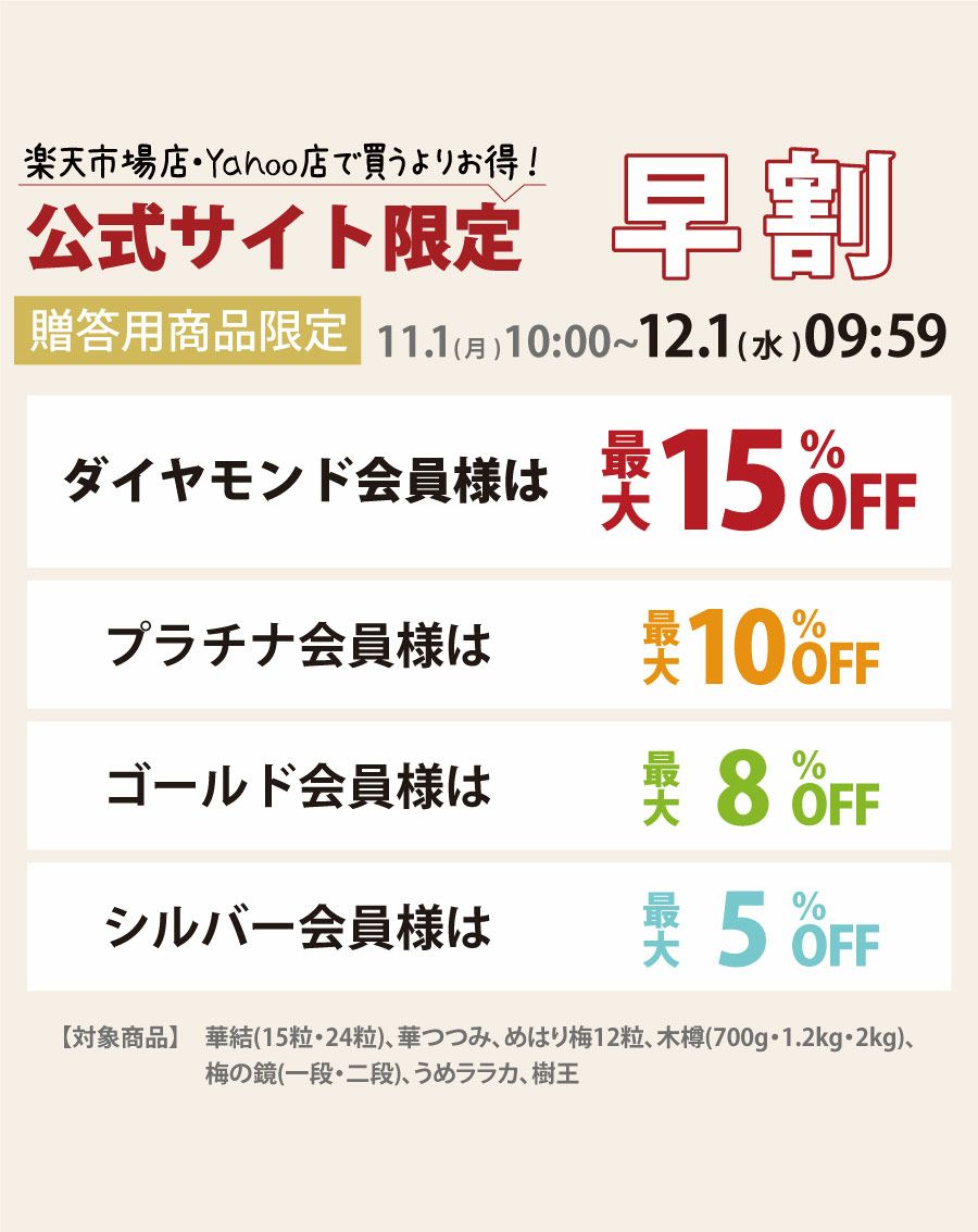他の画像を見る お歳暮ギフト\早割150円OFF/12/1(火)09:59まで 特選紀州南高梅お好みの梅干しを木箱にお詰めします【梅の鏡 2種二段(500g)】 贈答ギフト 木箱入 大容量 定価 ¥ 8,700 のところ 当店特別価格 ¥ 8,550 税込 会員価格あり 商品詳細を見る お気に入りに登録する