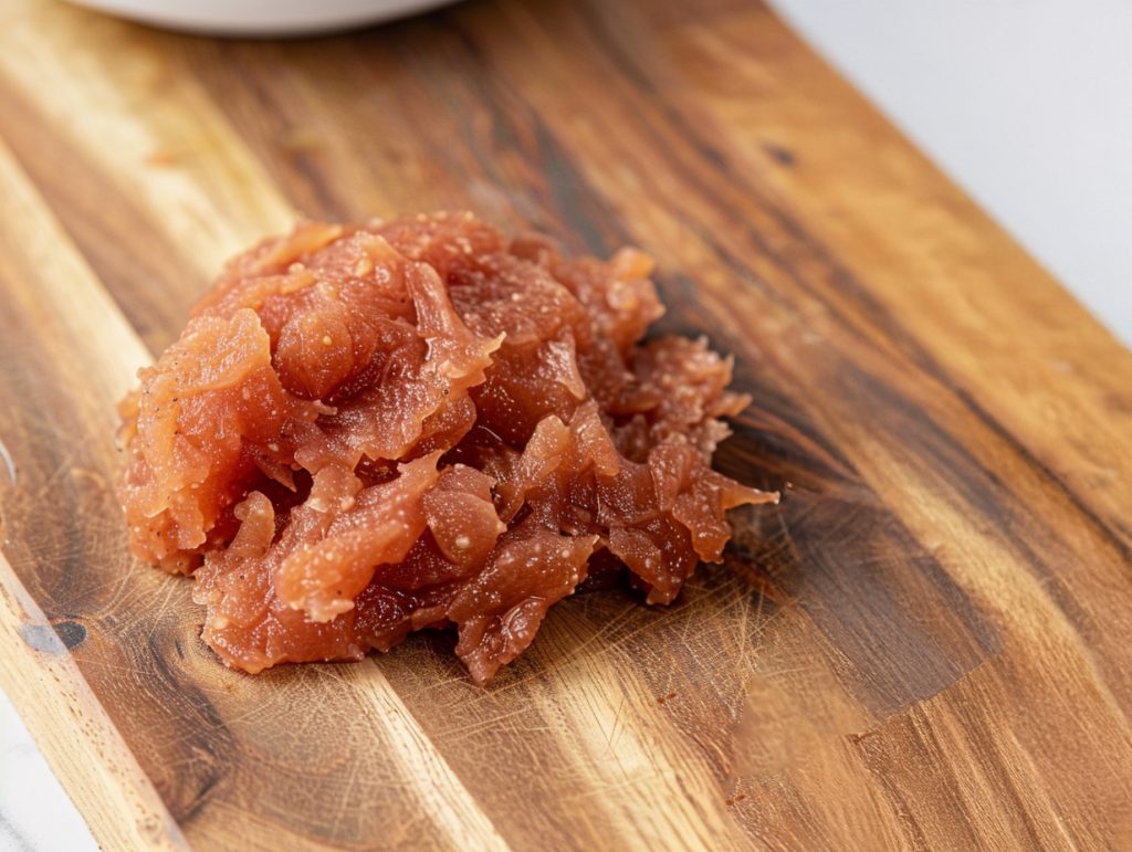 2.あまみつ梅は種を取り、包丁でペースト状に叩いておく。